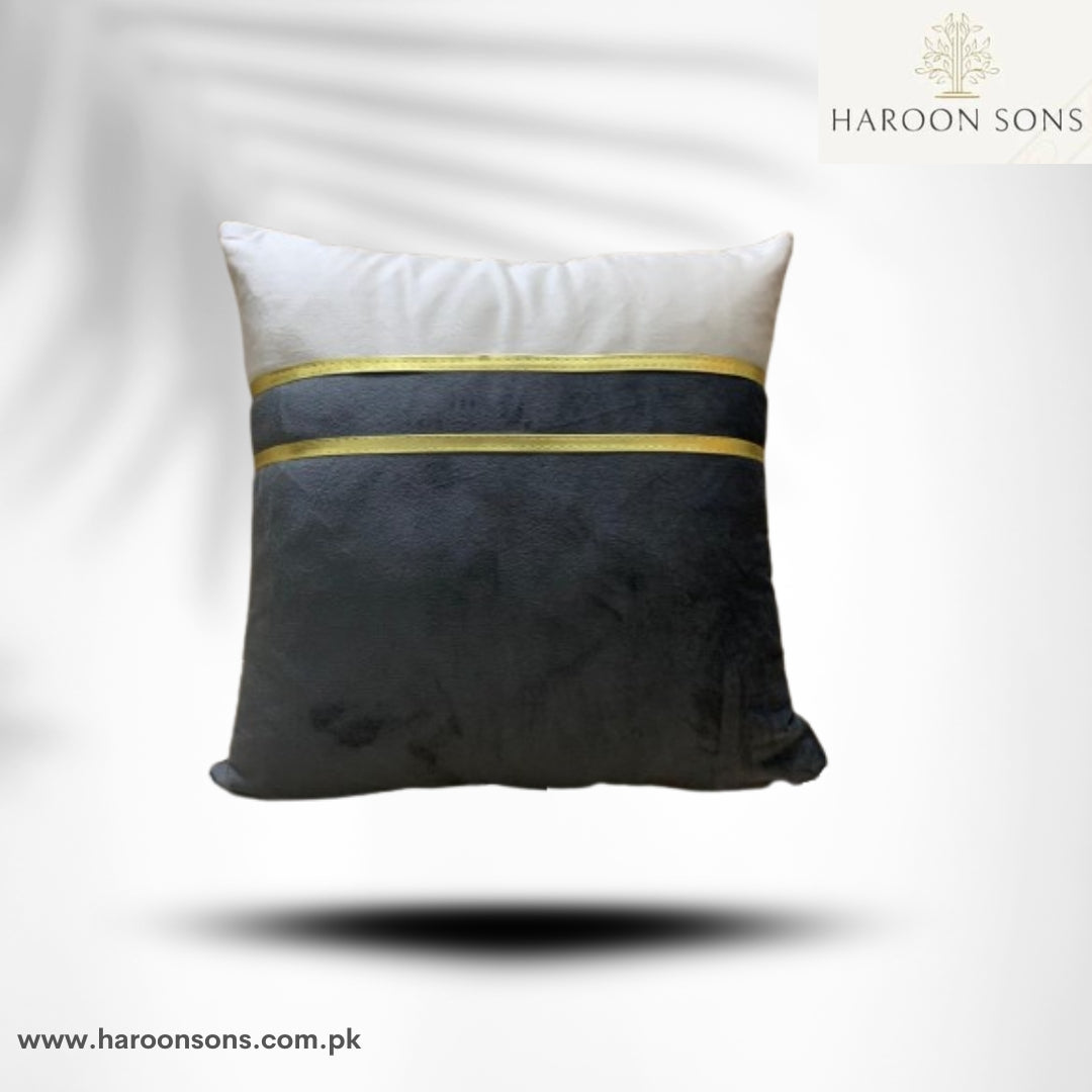 Transform your home décor with the Elegant Two-Tone Velvet Cushion Cover with Gold Accent from Haroon Sons. Expertly crafted to enhance both modern and traditional interiors, this premium cushion cover features a stylish combination of soft white and rich golden-brown velvet, accentuated by two sleek gold ribbons for a refined finish.